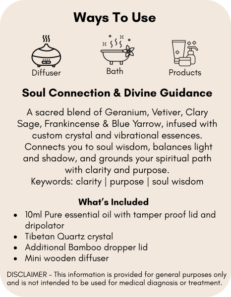 Blended with pure essential oils of Geranium*, Vetiver*, Clary Sage*, Frankincense Carteii, Frankincense Serrata* and rare Blue Yarrow, it carries a grounding yet expansive energy. Geranium, the ultimate balancer, steadies the heart and harmonises emotions, creating a sense of equilibrium between intuitive vision and grounded knowing. Enhanced with a custom crystal essence, Liquid crystals and Australian Bush Flower vibrational essences. 'Spirit' channels ancient wisdom and elemental energy to encourage deep connection and trust in your path.