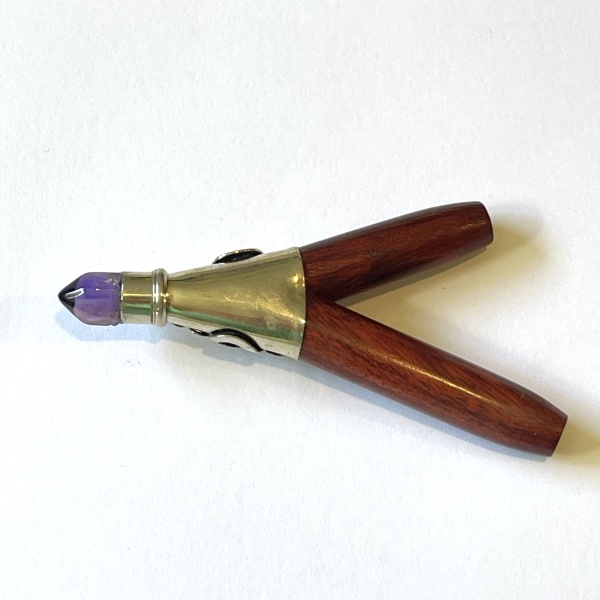 Kuripe with polished Amethyst point, decorative metalwork, ayahuasca vine and Peruvian Turquoise (Chrysocolla)