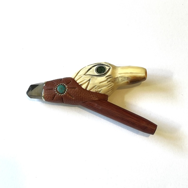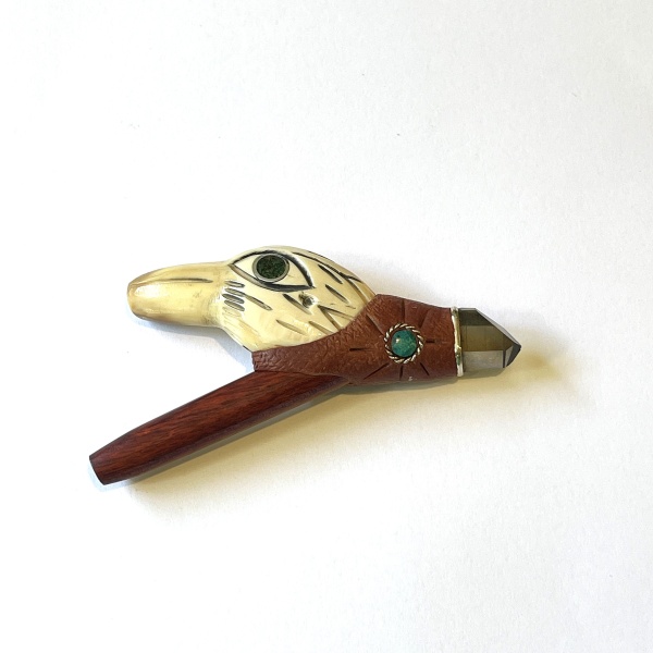 Kuripe with ayahuasca and carved fossilized crab claw with Chrysocolla and Smokey Quartz point